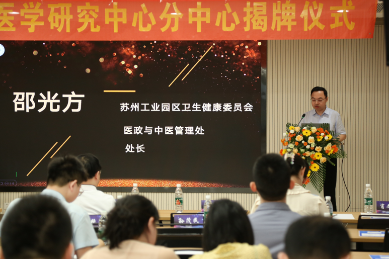 苏州工业园区卫健委医政及中医管理处邵光方处长代表园区卫健委对分中心的揭牌及青春期医学联盟启动表示祝贺。邵处长向来自各地的专家介绍了以苏大附四院为牵头单位、11家公立基层医疗机构为成员单位的“1+11+X”医联体建设体系。他表示,以此次分中心成立为契机,全力推进“预防-筛查-诊断-治疗”全周期健康服务体系,为广大儿童青少年及家长提供更优质的诊疗服务。
