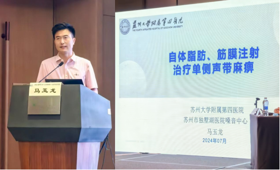 在此次学术盛会上,苏州大学附属第四医院耳鼻咽喉科的马玉龙副主任医师和吕尚瑞医生分别作了精彩报告。马玉龙副主任医师在咽喉会场中深入浅出地汇报了《自体脂肪+筋膜注射在单侧声带麻痹治疗中的临床疗效观察》。他提出的“声带脂肪+筋膜移植的嗓音重建”手术方案,通过利用患者自体组织进行手术,具有费用低、创伤小、风险低的优势,为声带麻痹患者带来了福音。