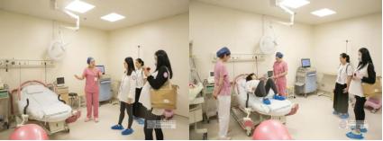 最后,产房助产士王颖为大家带来了“沉浸式分娩体验”。王老师为准妈妈们模拟一个完整的入院、待产和分娩的过程,指导准妈妈们们生产时拉玛泽呼吸法的使用、按摩、热敷等非药物镇痛方法。通过模拟分娩过程,孕妇们亲身体验了自由体位分娩球、花生球、分娩凳、助产车等辅助设备,以及芳香疗法和音乐分娩镇痛等辅助方法。这次体验不仅帮助孕妈妈们更好地了解了自然分娩的过程,还让她们身临其境地感受到在苏大附四院分娩时所能享受到的细致指导和贴心服务。