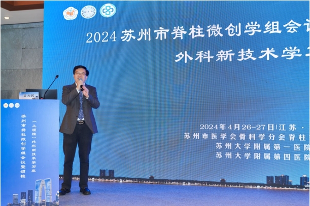 2024年4月27日,由苏州大学附属第四医院承办的“苏州市脊柱微创学组会议暨颈椎(上颈椎)外科新技术学习班”顺利召开。苏州市医学会谭秋生秘书长、苏大附四院党委书记侯建全教授以及骨科泰斗唐天驷教授到会致辞。会议邀请了江苏省人民医院脊柱外科殷国勇教授、东南大学附属中大医院吴小涛教授、安徽医科大学第二附属医院田大胜教授等国内著名骨科专家前来授课。大会开幕式由苏州市医学会骨科分会脊柱微创学组组长、苏州大学附属第四医院骨科主任姜为民教授主持。