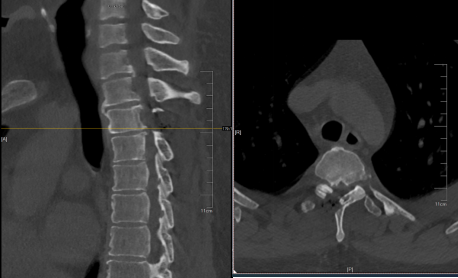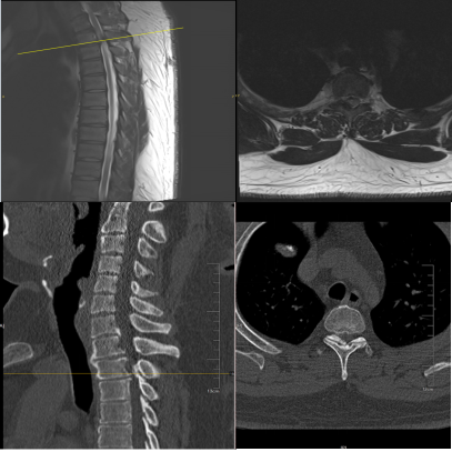 来自上海的32岁的王先生,身高196cm,体重160kg,BMI高达41.6(正常BMI一般在18.5-23.9),是一位名副其实的“巨人”。尽管身形魁梧,王先生却是一位优秀的长号手,毕业于音乐学院,拥有不少跟随他学习乐器的学生。然而,近一个多月王先生感到双下肢麻木。两周前症状迅速加重,双下肢的乏力、行走不稳,只能拄拐行走,不得不暂停授课。听闻姜为民主任的医术了得,王先生慕名前来就诊。CT及MR检查结果显示,王先生上胸椎T2-3水平黄韧带骨化伴严重的胸椎管狭窄。