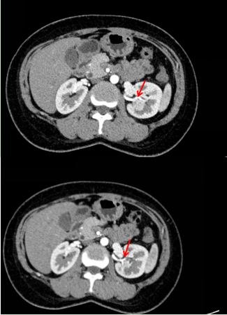 浦主任认真查看了李女士的CT图像:肿瘤大小约3.5*3.5*3.3cm,并不算大。然而肿瘤的位置较深,大部分埋于肾脏内,靠近肾盂和肾动脉,特别是肿瘤的上极紧贴两支肾动脉的分支。手术过程中一旦损伤动脉,很可能无法保留左肾,甚至可能引起大出血,危及生命。然而,直接进行左肾切除对于年轻的患者来说非常可惜。浦主任决定先将李女士收住入院,完善术前检查的同时组织科室内讨论,力争为患者制定安全可靠的保肾手术方案!