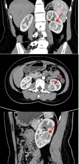 左肾肿瘤的冠状位、横断位、矢状位增强CT图像