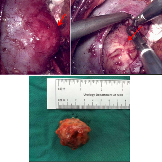 手术当天,一切按照预定的手术方案稳步进行着。首先,浦主任及其团队成员分离了肾周组织,充分暴露出肿瘤所在位置,发现肿瘤仅有少部分凸出于肾脏。随后,浦主任将肾脏和肾动静脉充分游离,临时阻断肾动脉,沿着肿瘤边缘完整剜除肿瘤,过程中避开肾动脉分支。最后,缝合肾脏后解除血管阻断,发现肾脏血供良好,无活动性出血。手术过程平稳有序,肿瘤完整切除,术中出血不多。