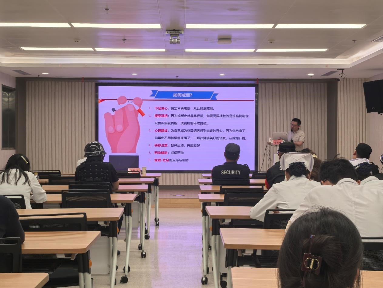 本次世界无烟日宣传活动,特别邀请到我院呼吸与危重症医学科曾大雄主任带领大家一同分析烟草危害,探寻科学控烟之路。曾主任指出,吸烟严重危害健康,烟草烟雾中含有焦油、一氧化碳、苯并芘、尼古丁等有害物质。尼古丁进入人体后,会迅速刺激大脑释放多巴胺,让人产生愉悦感,反复作用下,大脑逐渐对其产生依赖,形成难以摆脱的烟瘾。一旦减少吸烟量,多巴胺降低便会引起易怒和紧张等戒断症状。此外,曾主任还用详细数据敲响警钟,吸烟是慢性支气管炎和肺气肿的主要诱因,吸烟会诱发冠心病、脑卒中,肺癌等多种癌症。曾主任提出,医务人员作为健康“守门人”,不仅要以身作则,带头戒烟,更要掌握专业的戒烟方法。下定戒烟决心,做好心理建设,再配合运动、兴趣爱好转移注意力,必要时寻求专业医生帮助,通过药物干预和心理疏导,提高戒烟成功率。