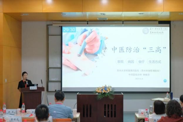 苏州大学附属第四医院中西医结合科副主任医师韩植芬从多维度阐述了中医防治“三高”的方法;神经内科郝永岗主任医师分享了卒中的识别和救治要点;神经内外科佘孙菊副主任护师则围绕心血管疾病围术期血压、血糖、血栓及营养护理进行了讲解;神经内科王瑞医师带来了阿尔茨海默病的最新诊疗进展。最后,苏州大学康复研究所副所长鲍捷教授不仅讲解心脑血管非药物治疗,还亲自带领学员进行室内训练,亲自指导学员掌握腹式呼吸、八段锦、起坐训练等使用技巧,将学习班气氛推向高潮。