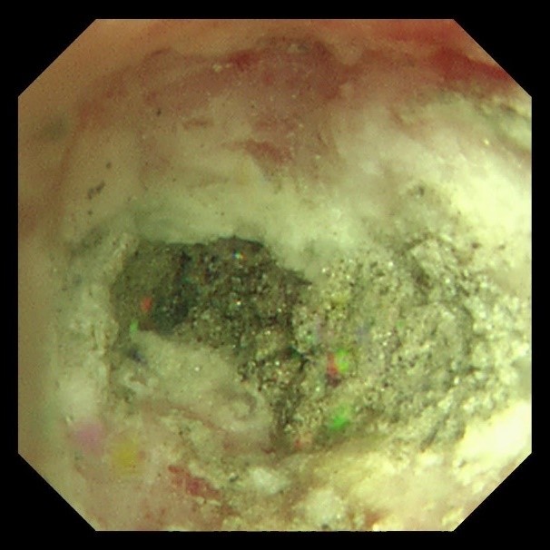 两天后复查支气管镜,发现患者左下叶背段远端细支气管仍有残留泥沙样异物。团队采用超细支气管镜联合冷冻技术,通过冷冻探头将异物凝固,再用超细活检钳逐支清理,实现对远端气道的彻底清理,实现气道“零死角”。