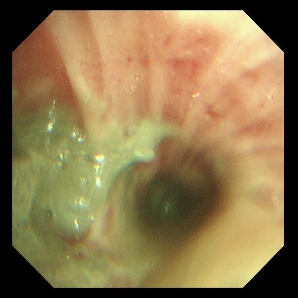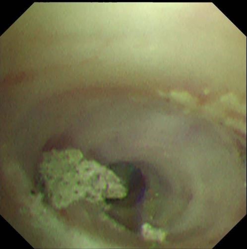 (超细支气管镜见左下叶背段远端支气管泥沙样物质)
