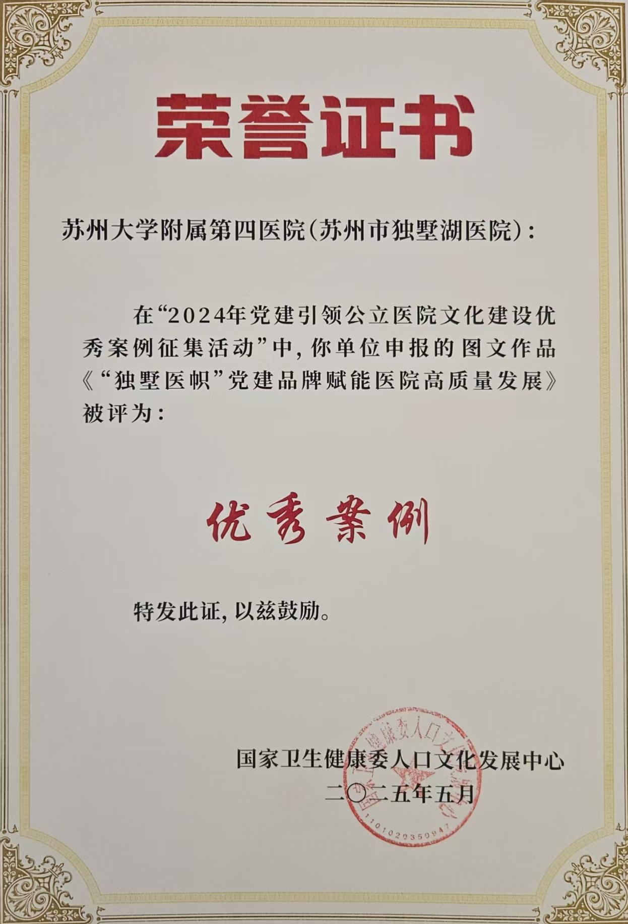 苏州大学附属第四医院获评“2024年党建引领公立医院文化建设优秀案例”