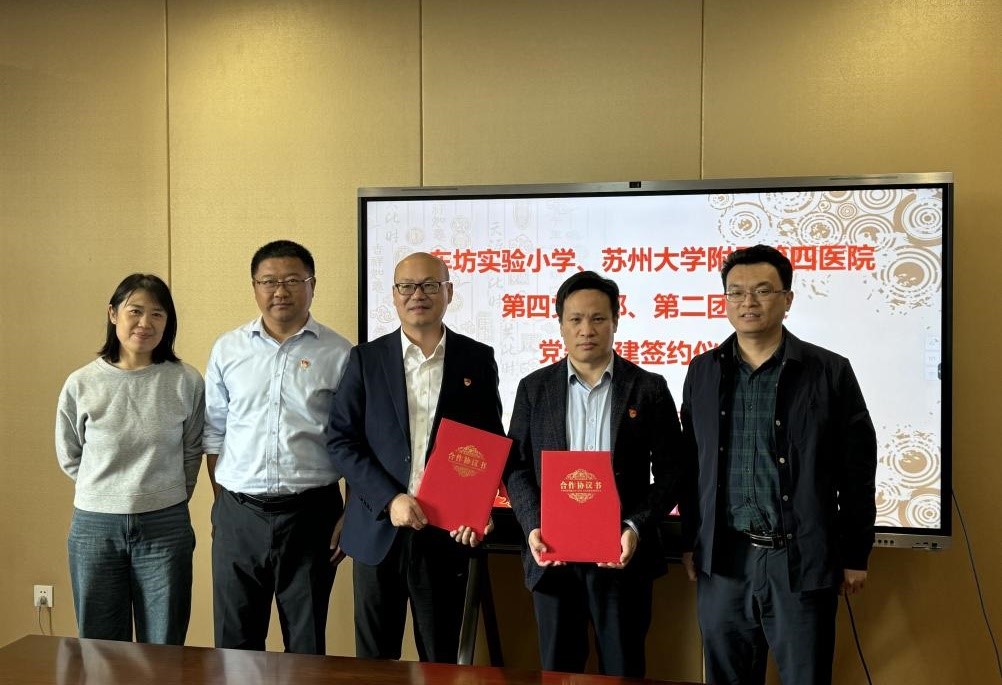 为进一步发挥公立医院公益性属性,助力校园“明眸皓齿”行动,强化党团引领作用,10月24日,由苏州大学附属第四医院组织人事处牵头,第四党支部和第二团总支一行与苏州工业园区车坊实验小学进行共建交流,签订教育基地共建协议书。