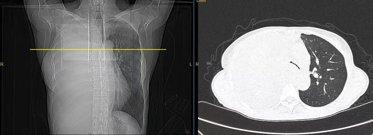 患者丁女士,今年55岁,1年前在外院被确诊为小细胞肺癌,由于对疾病认识不足,选择仅依靠保健品和中药调理。1个月前,病情急剧恶化,出现胸闷气促、腹部不适、进食困难,体重骤减6公斤。外院检查发现右肺不张、胸腔积液及胰体转移瘤,并因肿瘤广泛浸润导致气道严重狭窄。