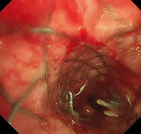 术中发现,右主支气管完全闭塞,肿瘤新生物广泛浸润;左主支气管混合性狭窄,狭窄率高达70%,并伴有黏膜浸润样改变。团队冷静而高效地操作,仅用不到1分钟便将支架精准置入目标位置。置入的可过活检孔道气管支架成功打开了左侧主支气管,同时确保上下叶开口通畅。患者呼吸困难立即减轻,胸闷气促的折磨被迅速解除。术后,丁女士激动地拉着蒋军红主任的手,激动着说:“已经三天三夜没能躺下睡觉了,谢谢你们让我又能喘口气!”