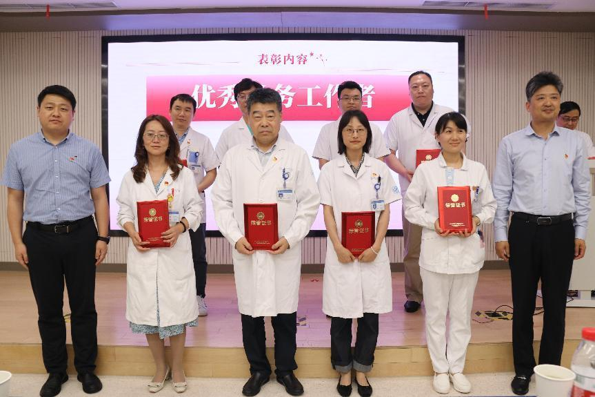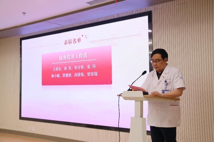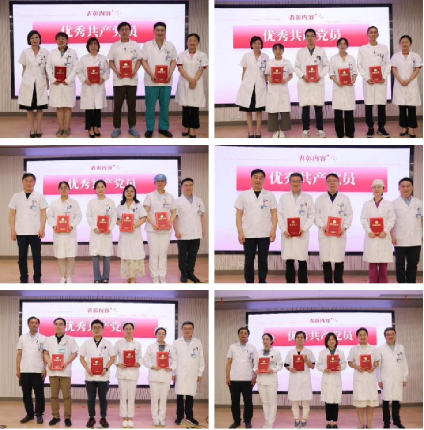 方琪副书记宣读医院党委表彰优秀共产党员(29名)、优秀党务工作者(8名)、先进基层党组织(1个)的决定。在表彰环节,刘春雷主任、钱福良书记、巢为农主任、医院领导为获奖集体和个人颁发奖牌和荣誉证书。