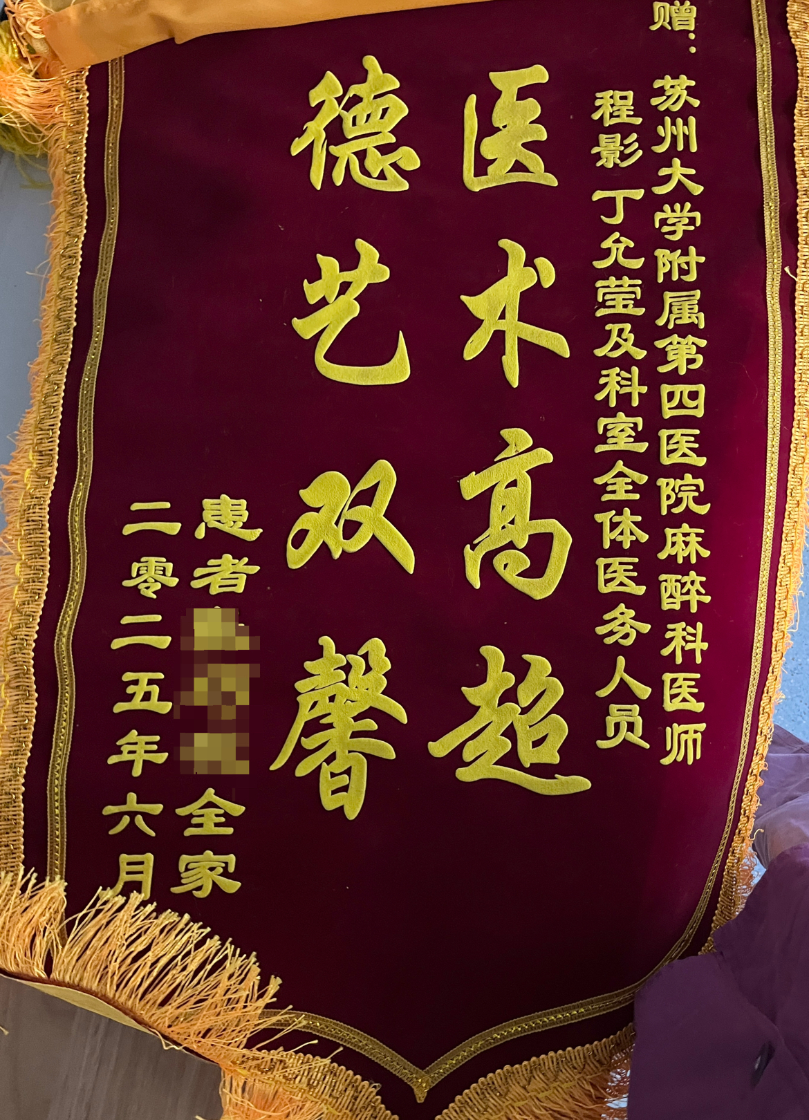 患者张先生及家人赠送锦旗感谢我院麻醉手术科程影、丁允莹医师及科室全体医务人员