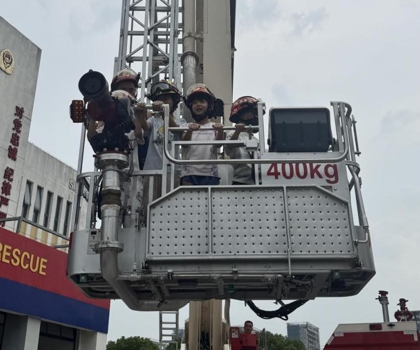 火灾模拟屋体验环节紧张而有趣,模拟屋内模拟了火灾发生时的场景。在消防员叔叔的指导下,孩子们按照之前学到的逃生技巧,弯着腰、用手捂住口鼻,小心翼翼地从模拟屋中成功“逃生”。活动最后,也是小朋友们最为期待的体验消防云梯环节。当云梯缓缓升起时,孩子们发出了阵阵欢呼。从高空俯瞰,消防站的景象尽收眼底,孩子们的脸上写满了激动与喜悦。