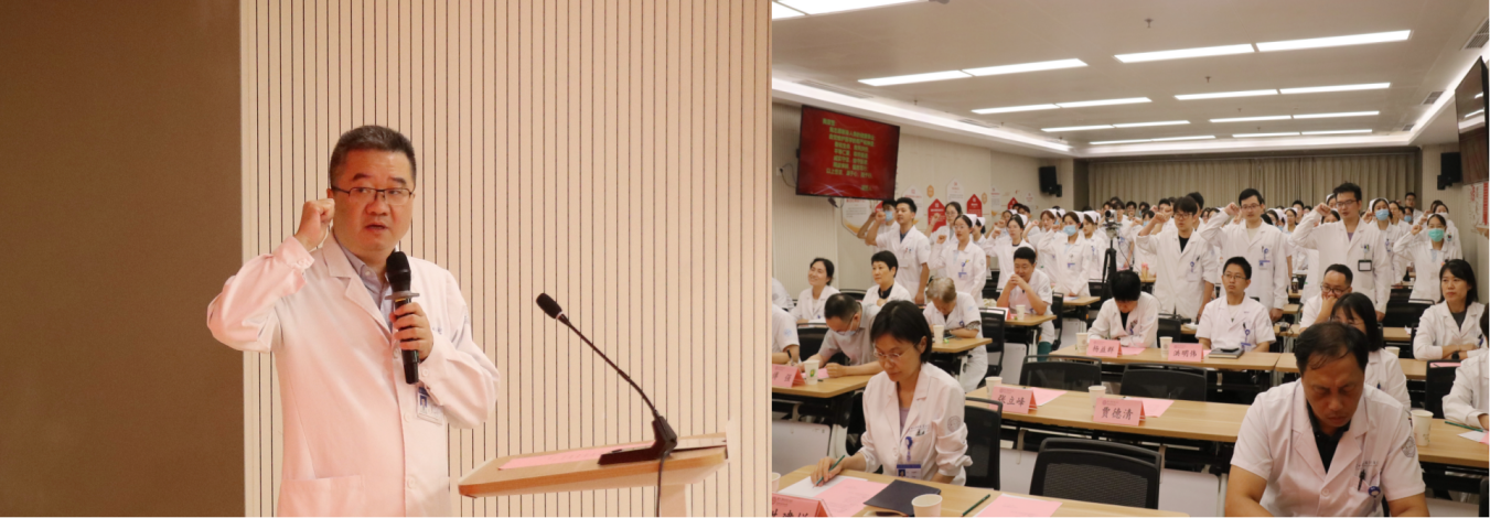 会议最后,侯建全书记回顾了医院自创建以来跨越发展的成绩:包括三级医院顺利验收,“国考”成绩显著提升,重点专(学)科与人才建设双轮驱动,党建引领医教研协同发展等。侯书记强调,面向未来,医院要高度注重医德医风建设,继续以党建引领铸就发展之魂,以党管人才激发发展潜力,以医教研协同发展共谱发展新章。侯书记对新职工提出三点殷切期望:一是医者仁心践初心;二要求真务实齐奋进;三要勇于创新敢担当。