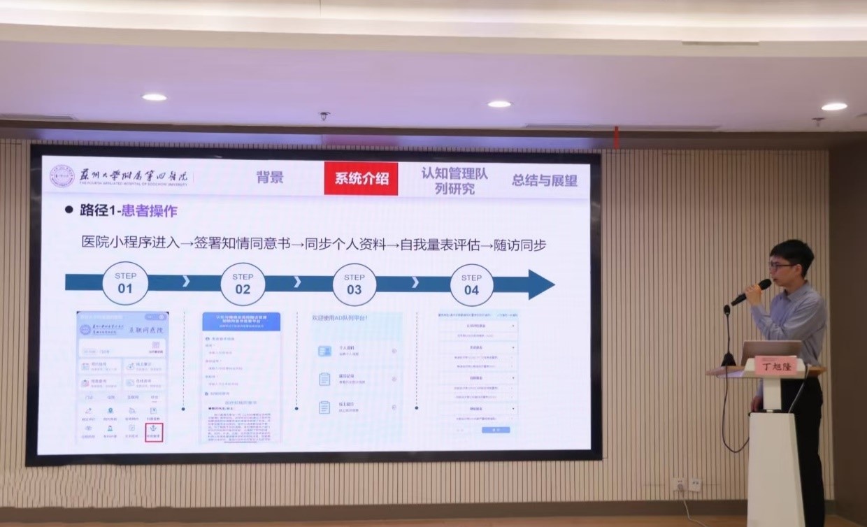 苏大附四院创新转化中心丁旭隆博士通过系统界面和功能模块的实时演示,详细讲解系统核心设计与临床价值。该系统支持全周期患者数据的自动化采集与结构化存储,同时支持患者可以在线进行量表自测,医生端可实时查看数据趋势、发起随访、调整用药,并借助单分子技术和质谱技术实现记忆和情绪健康的精准检测,为早期筛查和个性化治疗提供依据。