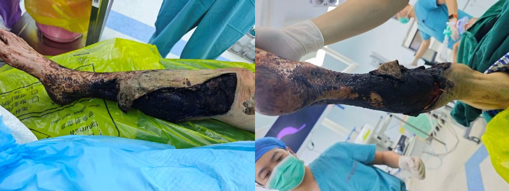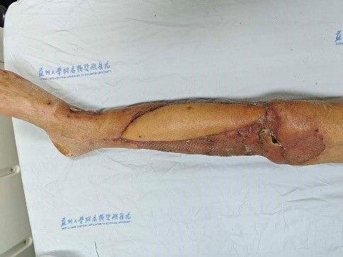 我院急诊收治一名72岁高龄患者,因硫酸烧伤双下肢入院,其中右下肢损伤尤为严重。该患者不仅合并心功能不全,全身血管还存在广泛硬化斑块。我院整形外科团队顺利完成游离股前外侧皮瓣修复下肢深度硫酸烧伤创面。