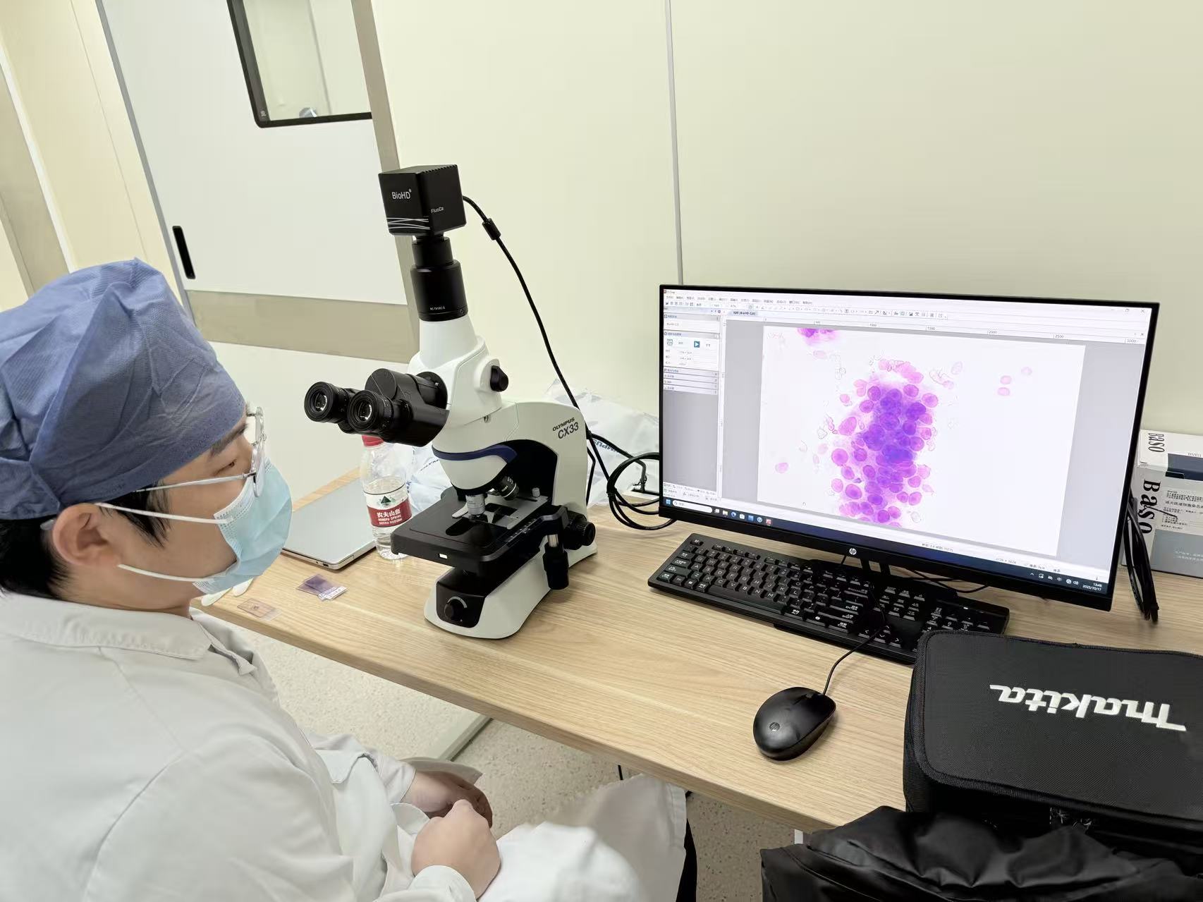 精准定位后,团队迅速开展TBLB(经支气管镜肺活检),精准获取病灶组织样本。与传统病理检查需等待3-5天不同,本次手术引入ROSE快速现场评估能够快速分析病理。我院张志阳医师在手术现场对样本进行快速染色、制片与显微镜观察,短短3分钟病理结果便明确反馈,明确病灶组织中存在肿瘤细胞。快速现场评估不仅避免了患者因等待病理结果而延误治疗时间,更省去了二次手术的麻烦,完美解决了肺部病灶诊断慢的痛点。