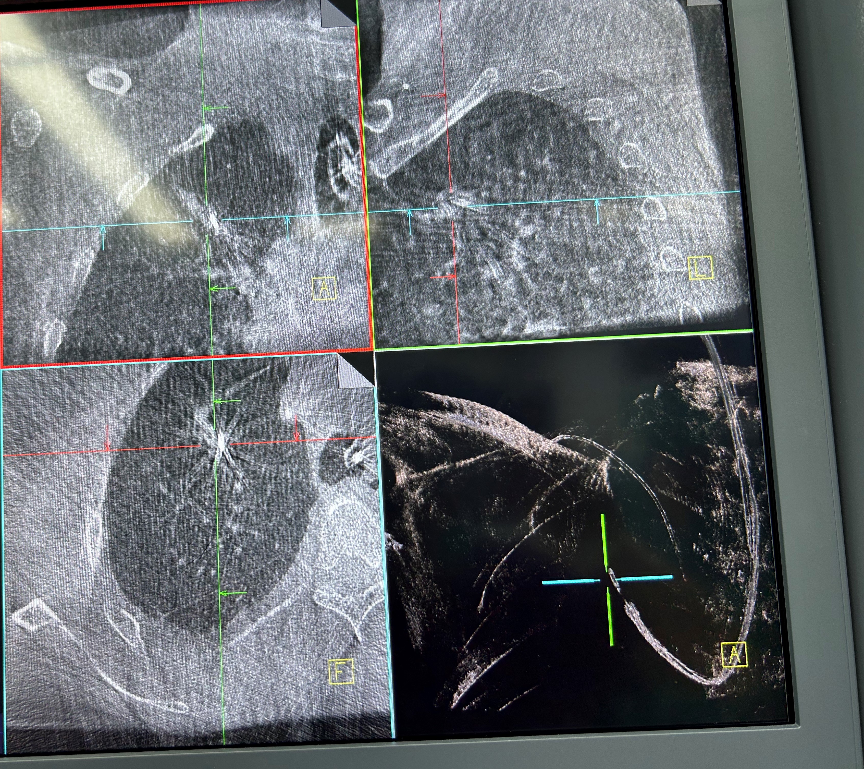 明确肿瘤诊断后,治疗方案即刻启动。团队经导航引导鞘管,精准插入一次性冷冻消融针(直径仅1.9mm)。再次通过CBCT确认消融针完全“扎根”于右上叶尖段病灶内后,开启冷冻治疗模式:以-160℃深低温冷冻10分钟、复温至45℃维持3分钟为一个治疗循环。完成了3次循环后,为确保病灶无遗漏,团队微调消融针位置,再次追加2次循环治疗。术后复查CBCT显示,病灶已呈现典型的冷冻后改变,术后两天复查胸部CT提示消融范围满意,治疗效果完全达到预期。整个手术过程中,患者生命体征始终平稳,术后第二天即可下床活动,真正实现了“微创治疗、快速恢复”的目标。