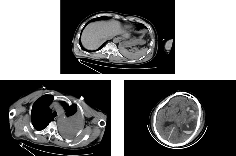 120急救车将居先生(化名)送至我院抢救室时,情况已经万分危急,时间就是生命!急诊抢救室团队立即启动应急预案,心电监护、吸氧、建立静脉通道、床边超声FAST筛查等抢救措施一气呵成。全身CT扫描提示患者全身上下存在颅脑、胸腔、腹腔等多处致命损伤。