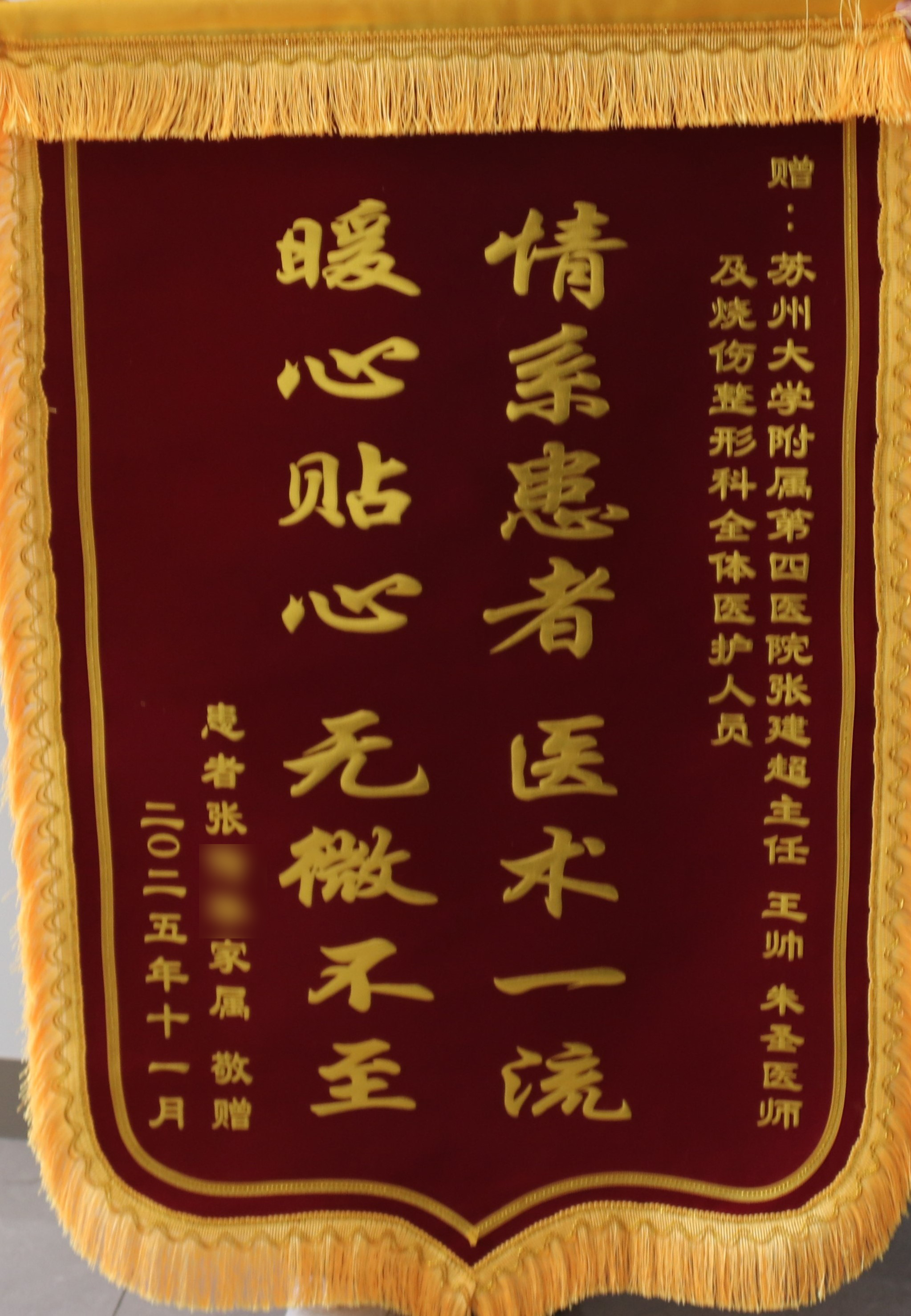 患者张先生家属赠送锦旗感谢我院整形外科张建超副主任医师、王帅主治医师、朱圣主治医师及整形外科全体医护人员