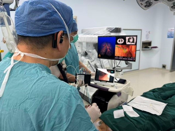 经过团队讨论,一个优化解决方案被提出:启用科室引进的前沿技术——电磁导航支气管镜系统。手术当日,在磁导航的实时引导下,手术团队娴熟地将吲哚菁绿注入目标结节区域,完成了对病灶的精确标定。整个过程患者无任何额外创伤,几乎零出血。