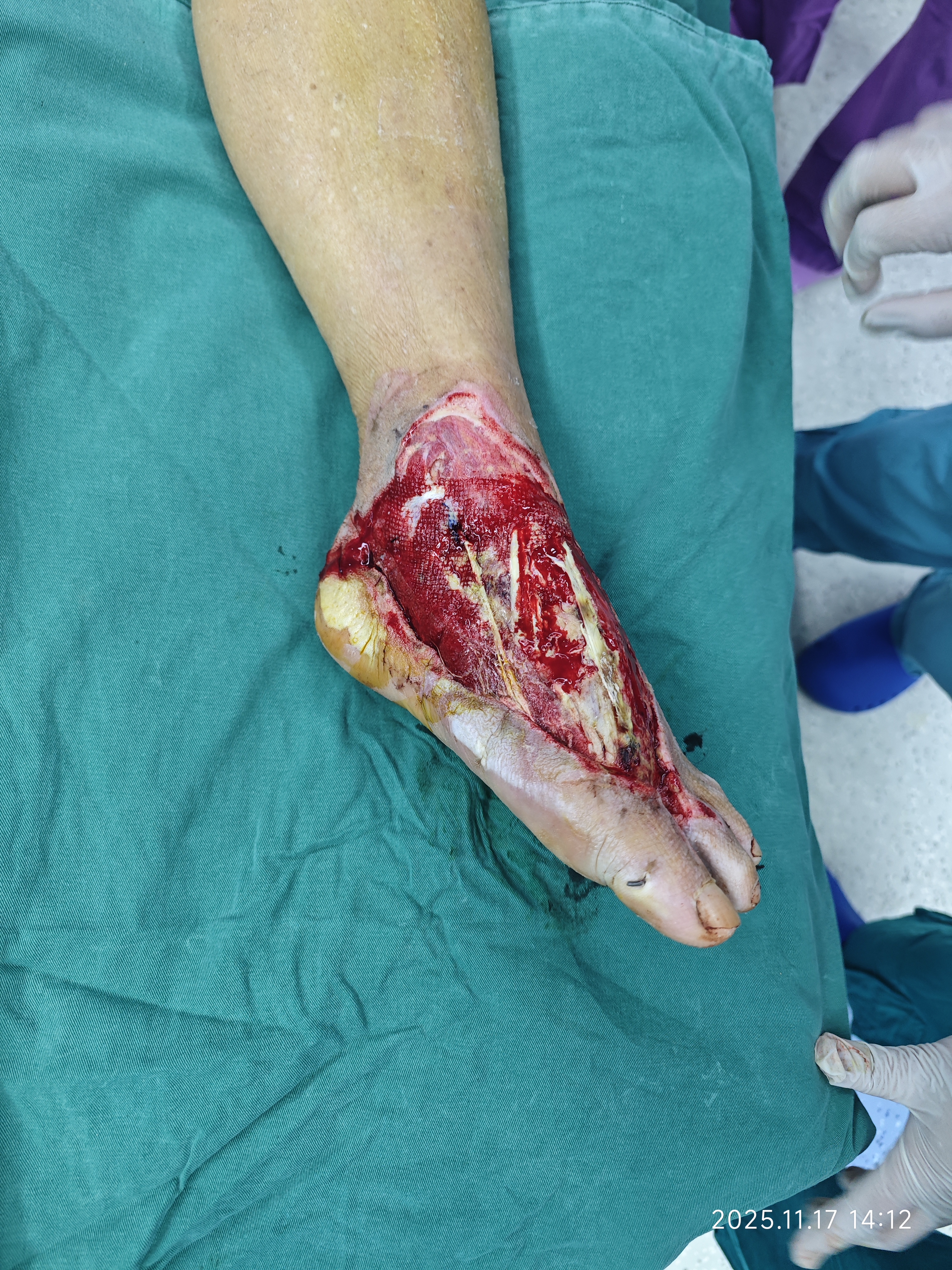 第一例手术,患者为73岁男性,团队为其实施高龄游离股前外侧皮瓣修复术。患者术前CTA提示血管硬化显著,患侧血管显影远差于健侧,血管条件的先天不足不仅大幅提升了显微吻合的操作难度,更让术中血流调控、术后抗痉挛抗凝护理充满不确定性,每一步都考验着团队的精准把控力。手术团队针对患者血管条件受限的特点,精确设计皮瓣,术中通过显微技术完成血管及神经吻合,并实时监控血流变化。术后团队对患者进行抗痉挛、抗凝及循环改善护理,皮瓣血运稳定,无感染或坏死迹象,患者恢复顺利,功能及外观得到良好改善。