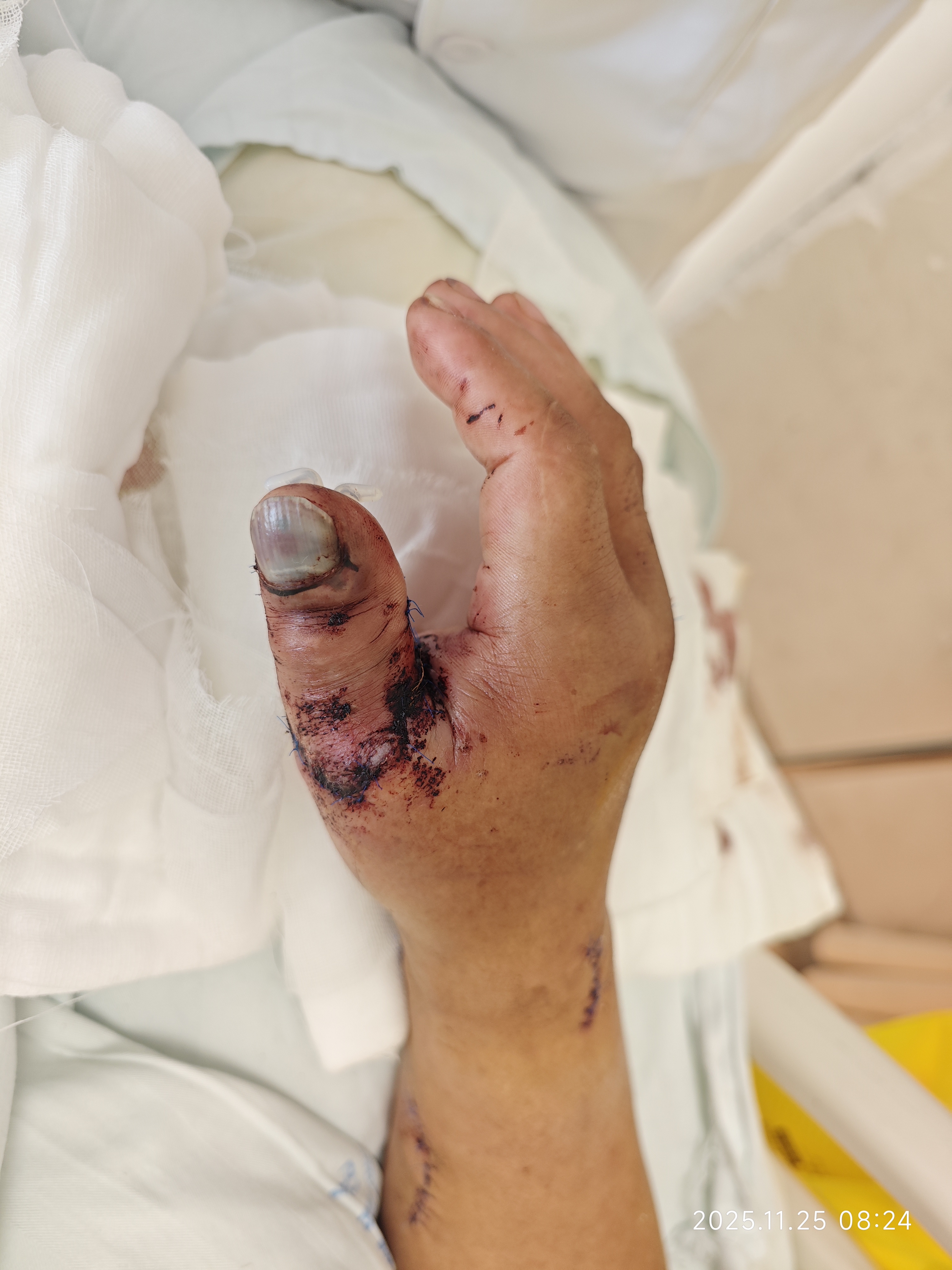 第二例手术,患者为61岁男性,右手拇指完全离断,拇长屈肌腱从前臂完整撕脱抽出,双侧指神经呈鼠尾状撕裂,于近节基底部彻底离断,离断指体挫伤淤青明显,指腹皮肤还伴横行裂伤。拇指暴力撕脱导致血管床严重破坏,吻合难度级数式增加,术后血管痉挛、栓塞的风险极高,容错率极低,几乎为零。搅拌机撕脱离断伤修复术堪称“极限挑战”。手术团队在极高风险条件下完成血管吻合、神经修复及肌腱重建,同时进行指体皮肤修复。术中多次评估血流,防止血管痉挛及栓塞,术后实施精准抗凝及感染预防护理。患者拇指血运稳定,指体皮肤及功能逐步恢复,肌腱及神经修复效果良好,并已开始进行功能训练。