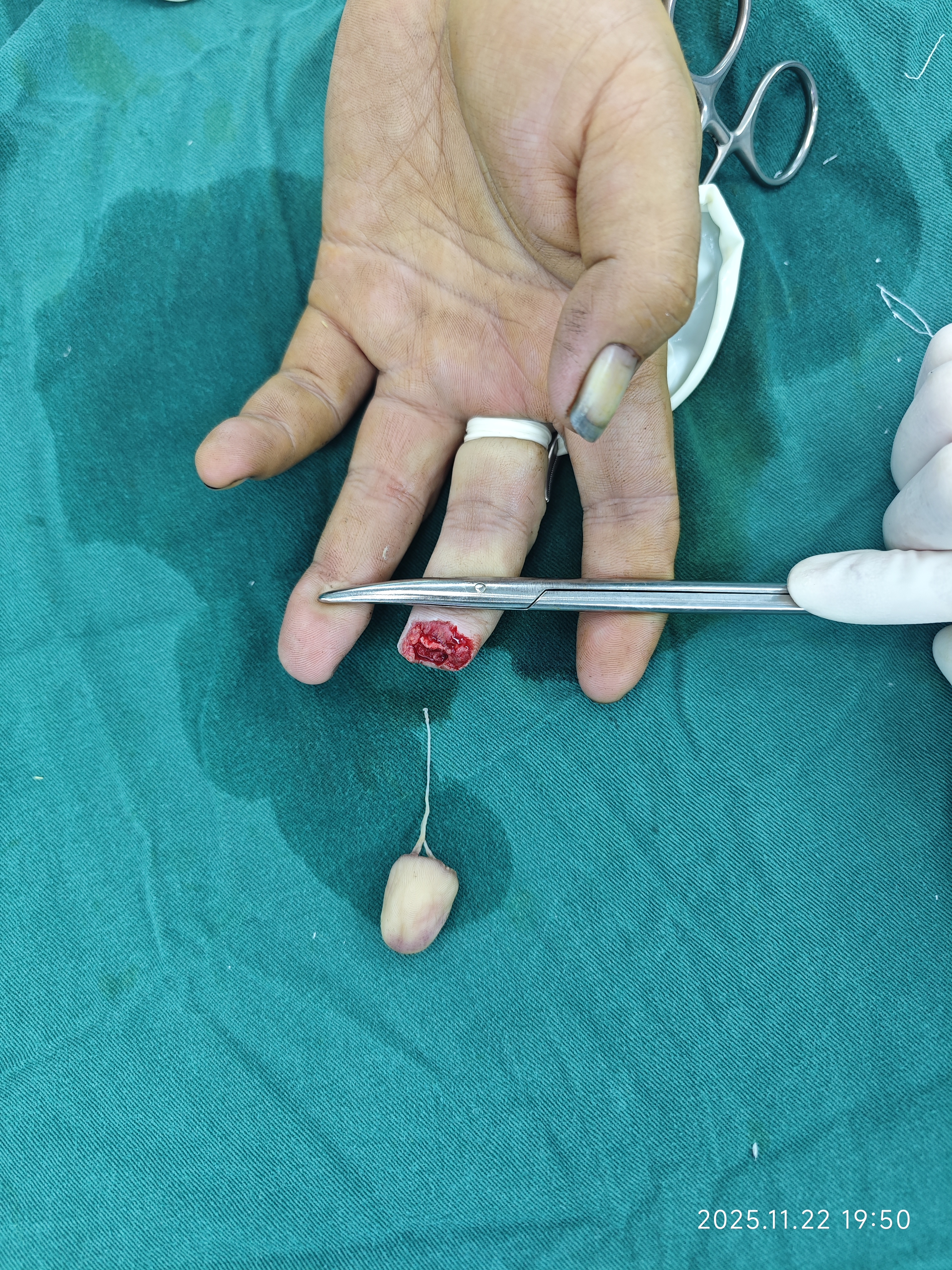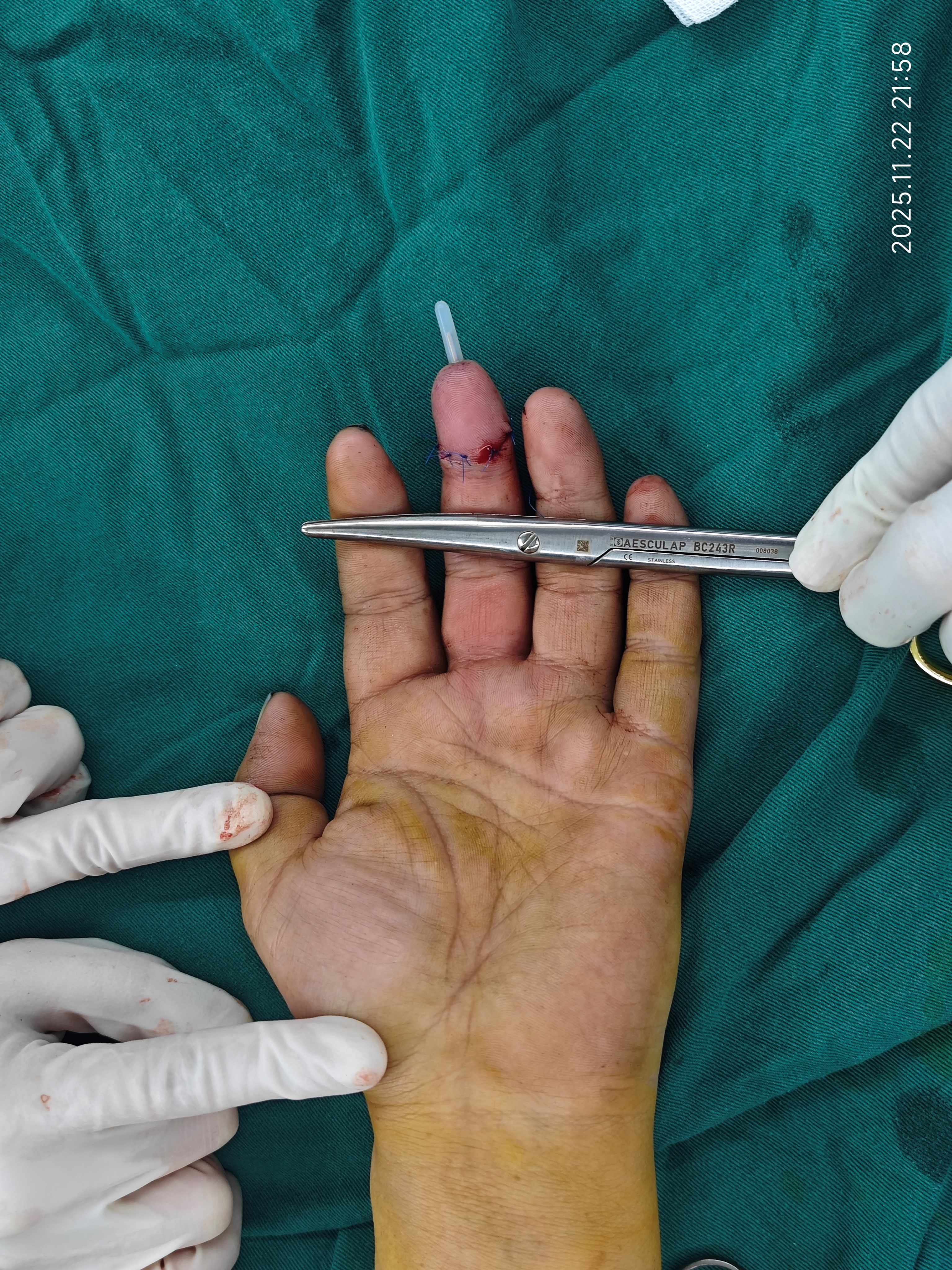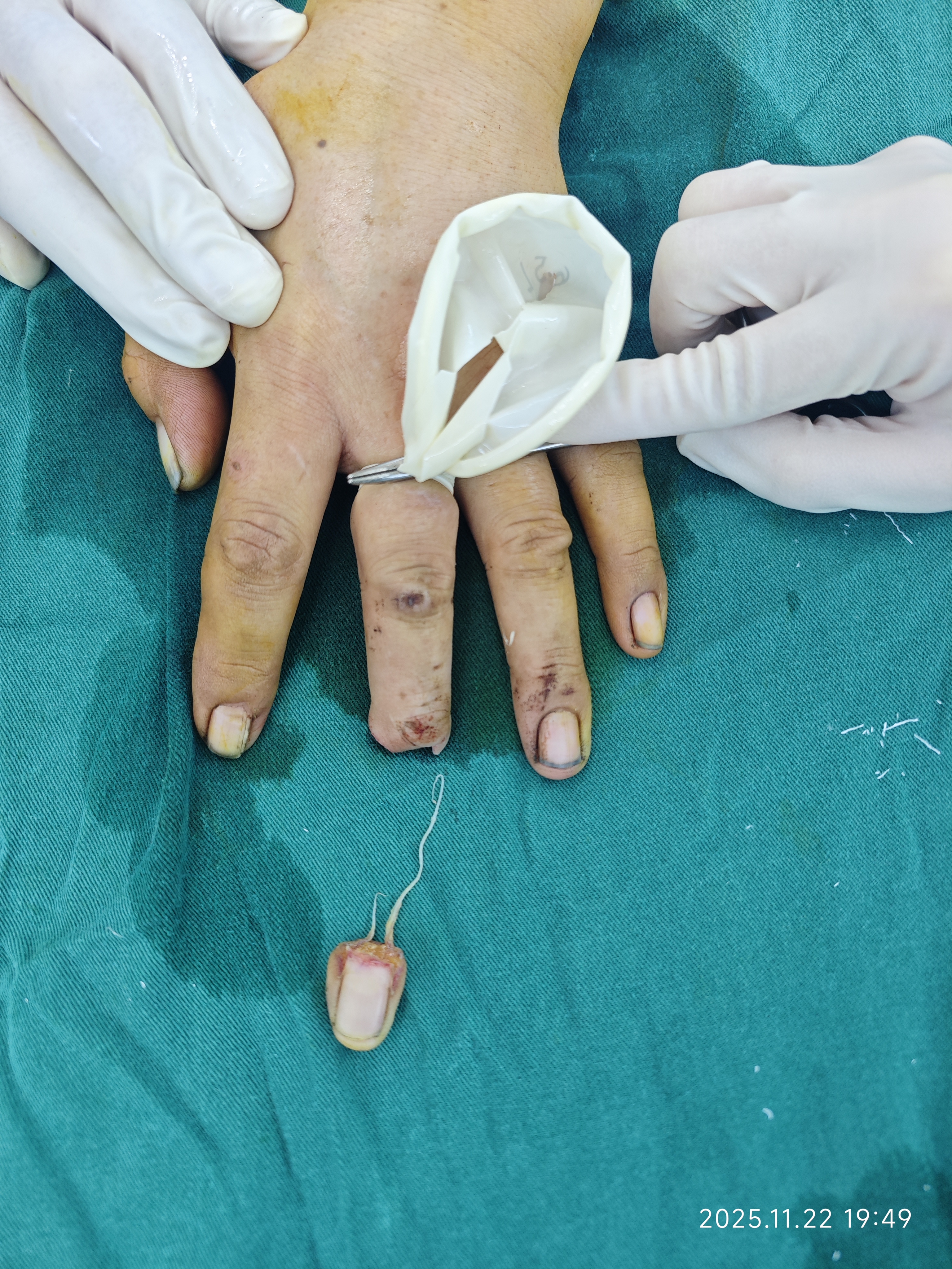 第三例手术,患者43岁男性,左手中指远节撕脱离断伤,且患者辗转我市三家医院后抵达我院,此时离断时间已超五小时,组织缺血缺氧的时限压力,让本就高难度的再植手术雪上加霜。团队快速评估离断组织状况行修复术,采用显微技术完成血管、神经及肌腱吻合,并进行指体皮肤修复。术中密切监控血流及组织氧合,术后4天换药,患肢血运良好,毛细血管反应正常,持续三抗治疗中。