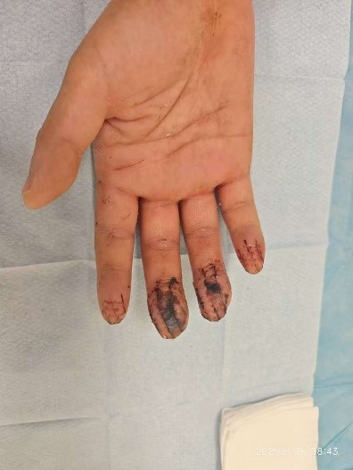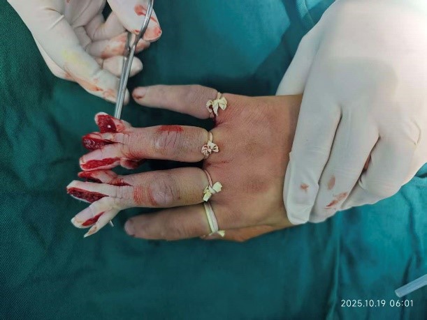 术前准备紧张有序推进,张建超副主任医师与洪爱子主治医师协同实施手术,术中发现患者中指与环指指动脉弓已被切割为三段。凭借高超的显微修复技术,医生们成功拼接动脉弓并恢复血运。观察到原本苍白的组织逐渐红润,手指成活的希望近在眼前。随后,医生进一步精细缝合,完成关节软骨、肌腱及神经的复位重建,手指外形初步恢复。