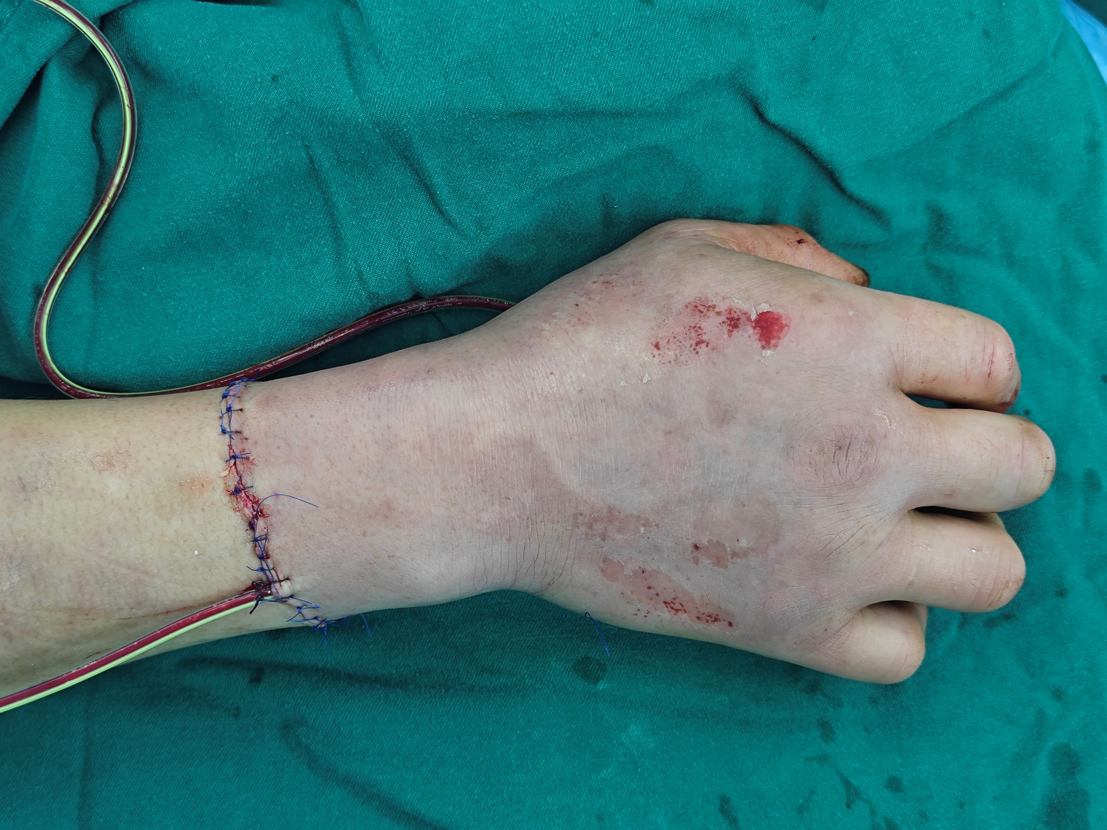 近日,苏州大学附属第四医院整形外科团队帮助一位右上肢脱套伤的患者恢复血运。此前,患者在工作中不幸被机器滚筒轧伤右上肢,伤情十分严重——右前臂下份及手背皮肤脱套至掌指关节以远处,撕脱组织挫伤明显,掌侧皮肤还伴有纵行裂伤,手部更是出现多发骨折。因伤情复杂,辗转多家医院未能得到理想治疗方案后,患者来到苏大附四院寻求帮助。