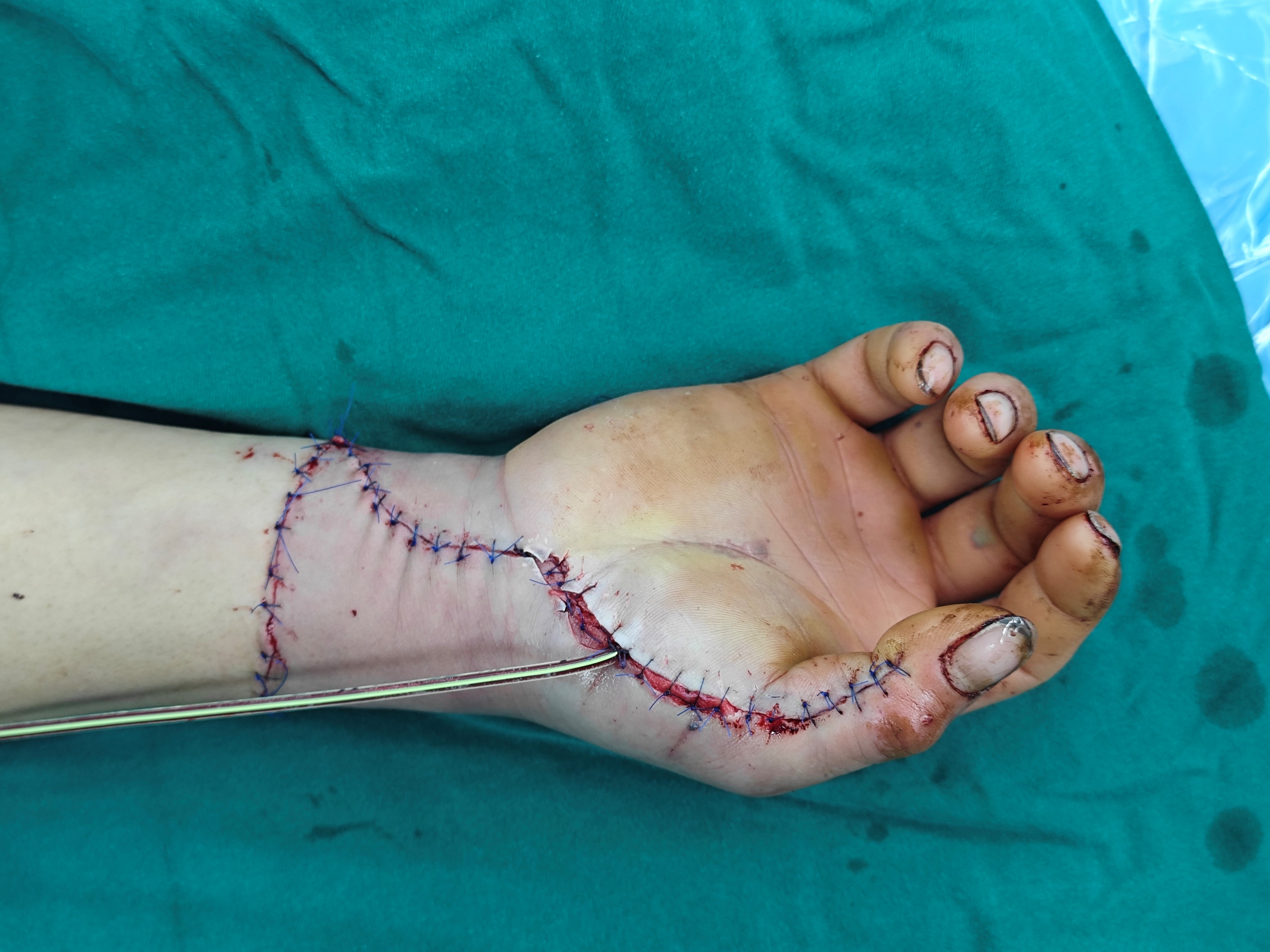 术中发现患者创面内布满大量异物,第五掌指关节已破裂且可触及异物,情况比预想的更为复杂。医护团队首先进行精细清创,仔细清除创面异物和坏死组织,随后精准止血,并逐一修复撕脱离断的肌腱组织。团队在复位脱套组织时发现该部位呈现明显淤紫,创面静脉断端有出血,而静脉回流能否重建,是帮助患者修复的关键。在高倍显微镜下,沈国良主任医师和张建超副主任医师带领团队开始了“绣花式”操作,他们先是小心翼翼地探查两侧静脉血管情况,随后凭借精湛的显微外科技术,前后吻合五对静脉。血管吻合完成后,原本淤紫的皮瓣逐渐红润,血运情况得到明显改善。