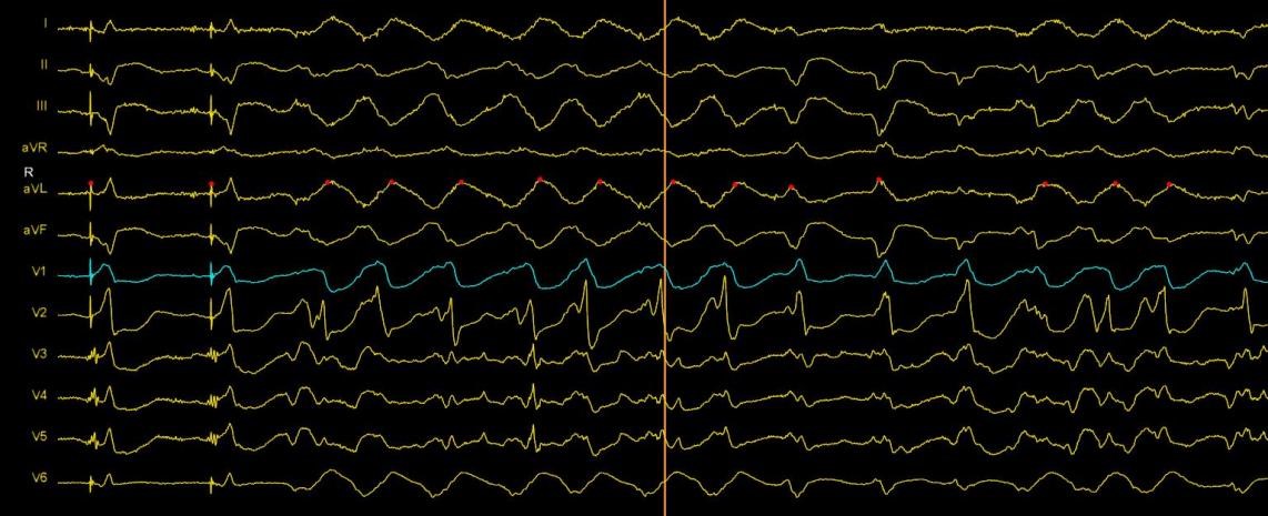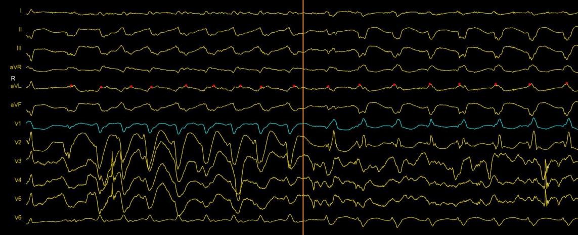 患者为79岁老年男性,9年前因反复气促在外院检查诊断为扩张型心肌病(DCM),6年前因室速晕厥于外院行CRTD起搏器植入,在规范药物治疗改善心肌重构、胺碘酮抗心律失常的情况下,仍多次室速发作、ICD反复放电。