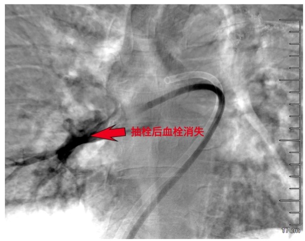 医生将一种专用的大腔血栓抽吸导管沿导丝送至血栓内部。随着负压的启动,血栓被源源不断地吸入体外收集装置。术后即刻的肺动脉造影显示,先前中断的血流通道被重新打通,右心压力随之下降。这场在血管内部进行的“疏通作业”,安静而高效,没有开胸的惊心动魄,却完成了同样关键的使命。