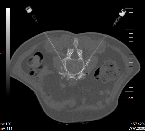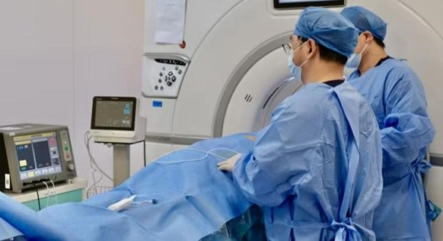 目前,疼痛科开展有两种微创介入手术方法治疗干预糖尿病性周围神经痛。一种方法是腰交感神经节射频消融+无水乙醇毁损术,通过CT影像精准定位L2椎体下缘、L2-3椎间盘和L3椎体上缘,对腰交感神经节实施热凝和化学双重毁损,阻断交感神经对下肢血管收缩异常指令,从而扩张血管以改善组织血供,以缓解疼痛和麻木症状。另一种方法是脊髓电刺激器植入术(SCS),通过植入式电极向脊髓特定节段输送低强度电脉冲,从而阻断或调制疼痛信号传导,有效缓解疼痛。