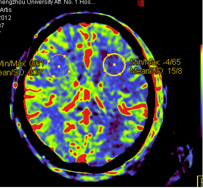 神经及灌注成像PBV显示组织血容量灌注信息的功能学影像,并根据彩色 编码进行量化,病人无需转运到CT室就能得到病灶完整的灌注信息。