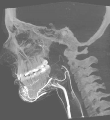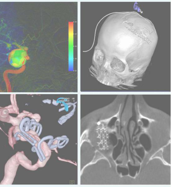 颌面部血管瘤栓塞术,额面部血管瘤具有复杂迂曲的血供,DynaCT增强扫描帮助鉴别滋养血管,功能学影像Dyna PBV Neuro为瘤体栓塞终点做精准评估。